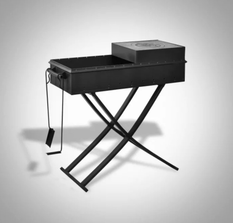 Мангал состоит из «коробки» и съемных опор (ножек), которые легко устанавливаются и снимаются. Очень надежный без излишеств вариант для любителей практичных вещей.