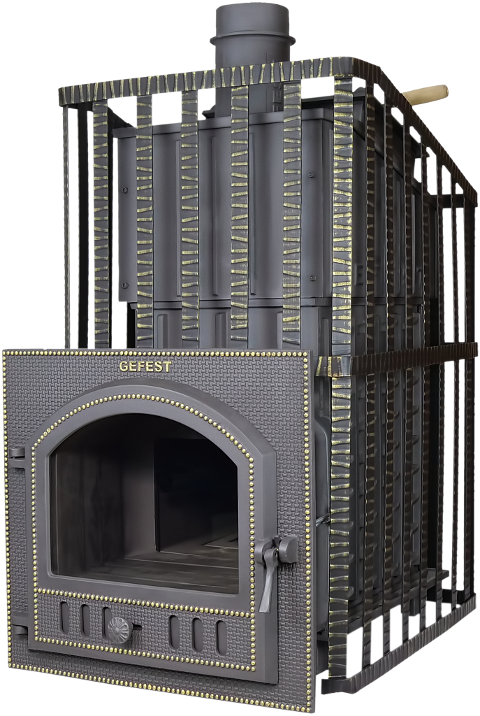 Гефест ЗК в сетке 30(П) Ураган - расширенный комплект печи Гефест ЗК в сетке. Максимально приближенный вариант печи для режимов русской парной, имеющий непосредственно закрытую чугунным коробом каменку, дверцу для пара с ручкой из бука, увеличенную до 50см чугунную стартовую трубу. Печь легко модернизируется до полноценной печи предназначенной для Русской бани путем замены стальной сетки на каменную облицовку без демонтажа дымохода.