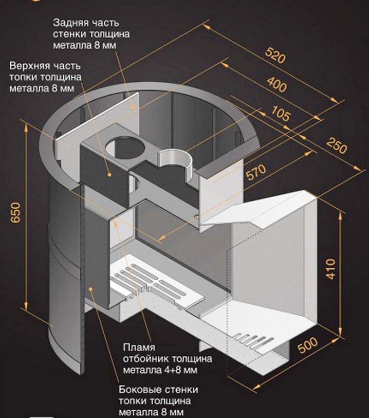 Сталь благодаря своей устойчивости к высоким температурам не подвергается деформации. Топочная дверца изготовлена из высококачественного чугуна. Длинная колосниковая решётка из массивного литейного чугуна, обеспечивает равномерное горение дров, столь необходимое для банной печи. Выдвижной зольный ящик позволяет удалить накопившуюся золу, не прерывая горения и эффективно регулировать его интенсивность. Все эти характеристики позволяют утверждать, что эту модель можно считать самой скоростной печкой по прогреву парильного помещения.