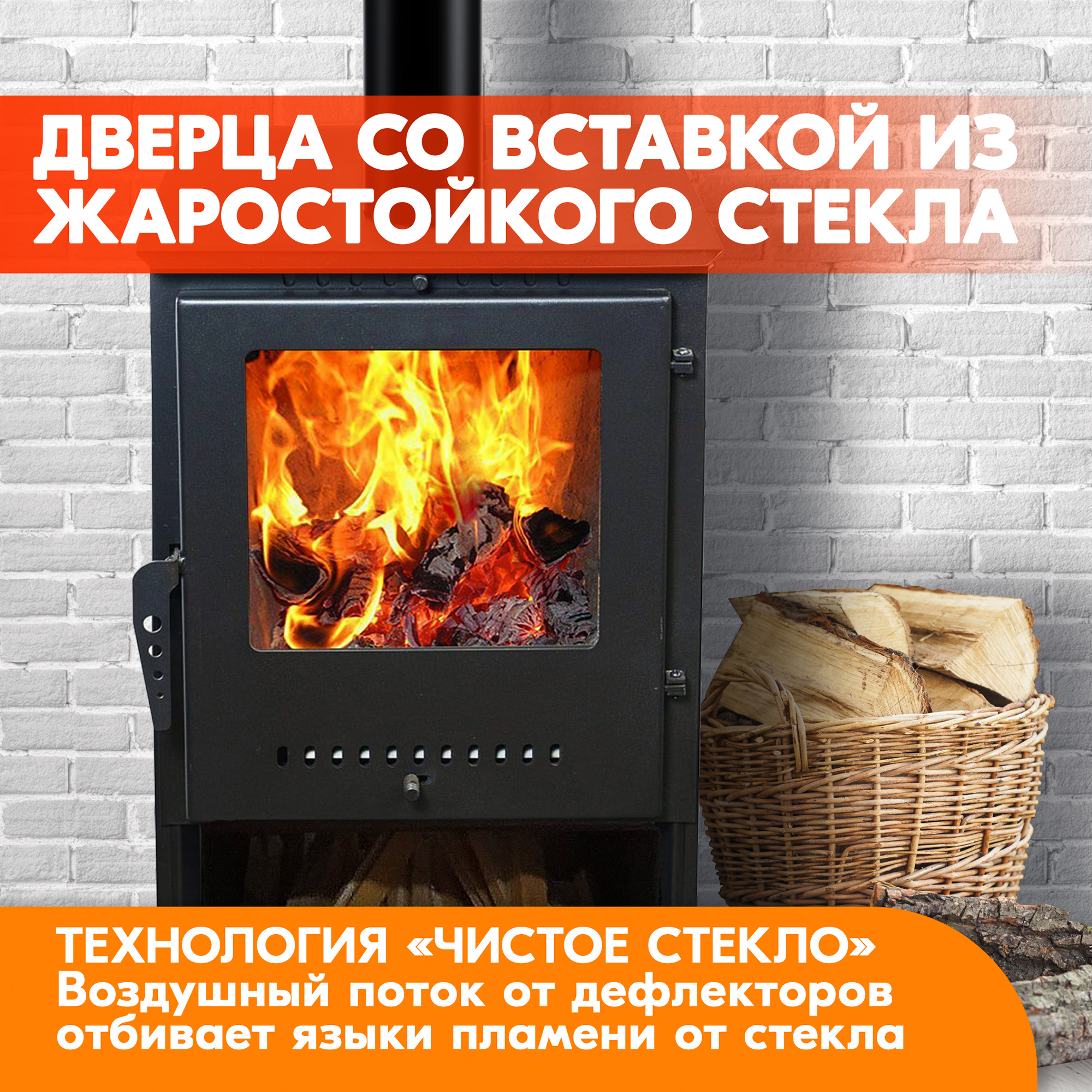 Конструкция печи-камина оснащена дверцей со вставкой из специального жаростойкого стекла, большое стекло позволяет наблюдать за янтарными переливами пламени.