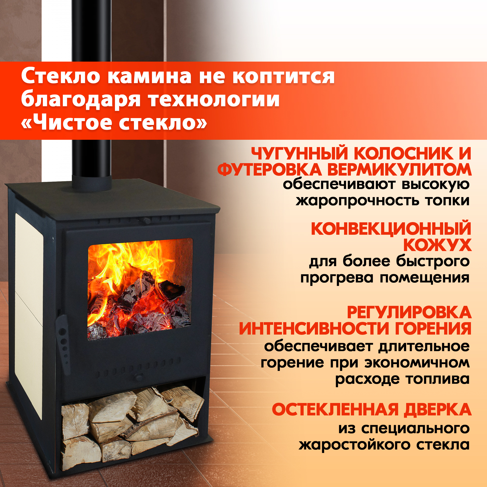 Стекло камина для дома не коптится благодаря технологии «Чистое стекло».