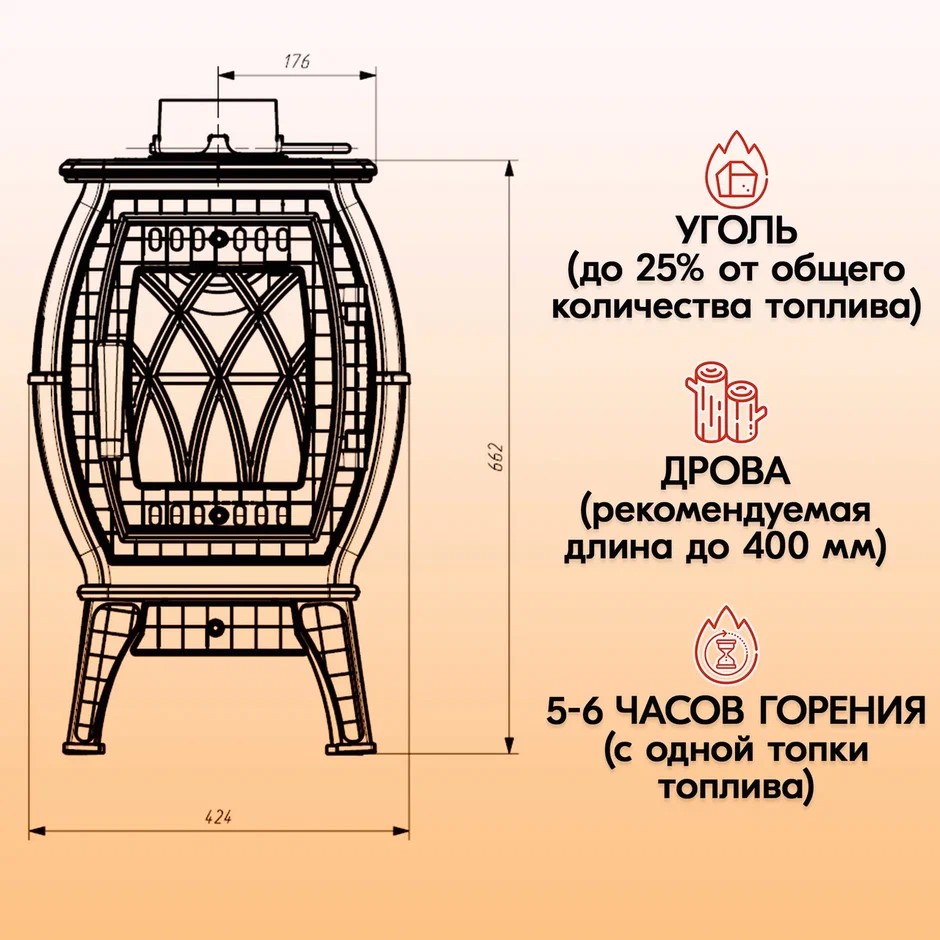 Максимальная загрузка дров и угля составляет 10 и 20 кг соответственно.