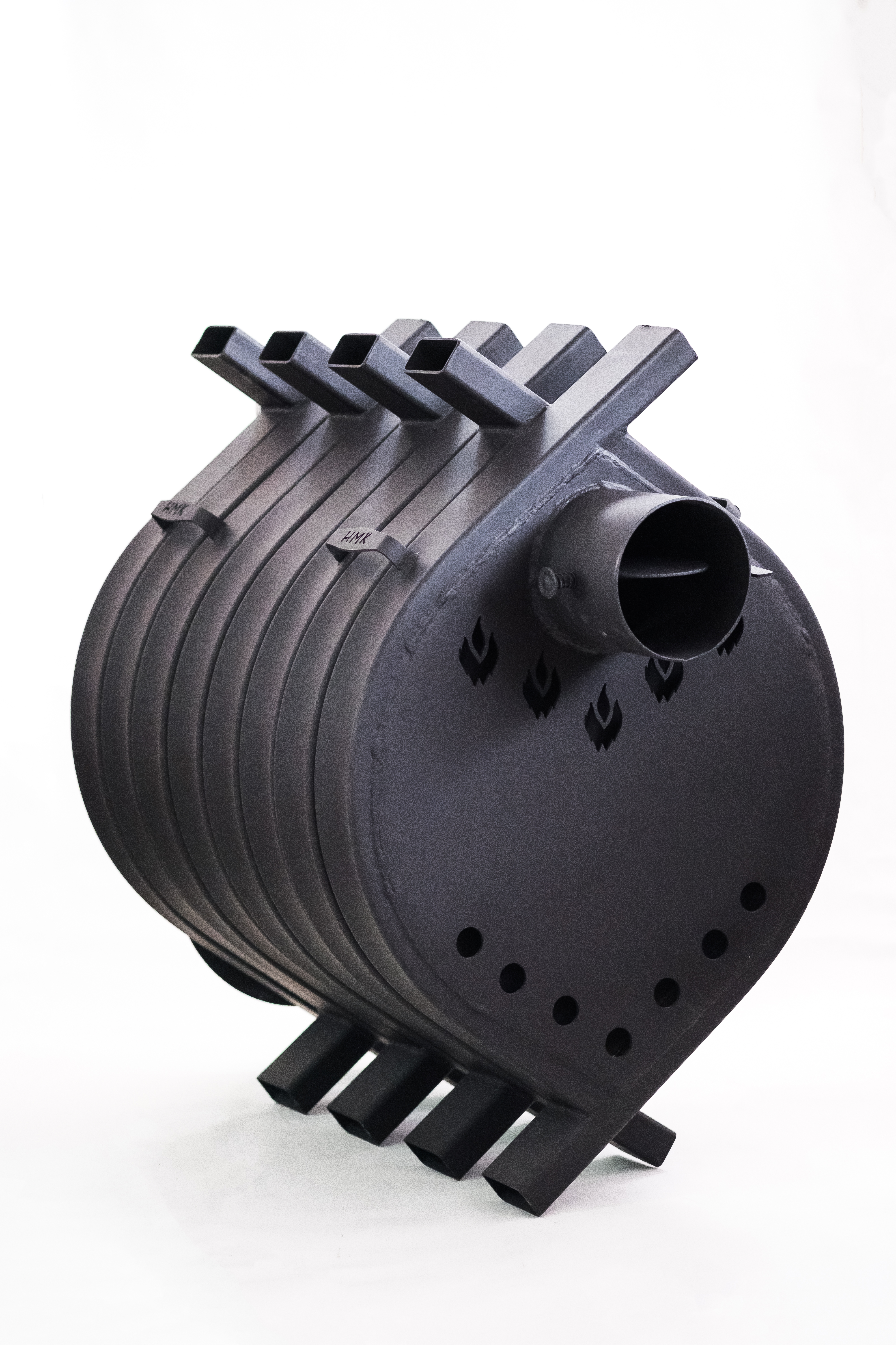 В конструкции данной печи также увеличена поверхность теплоотдачи и решена проблема интенсивного инфракрасного излучения при номинальной мощности ее эксплуатации. Холодный воздух, из отапливаемого помещения, за счет конвекции поступает в нижние отверстия теплообменных труб, а через верхние возвращается в помещение нагретым до температуры от 60 до 80 градусов.Таким образом, воздух равномерно нагревается и перемешивается по всему объему помещения.